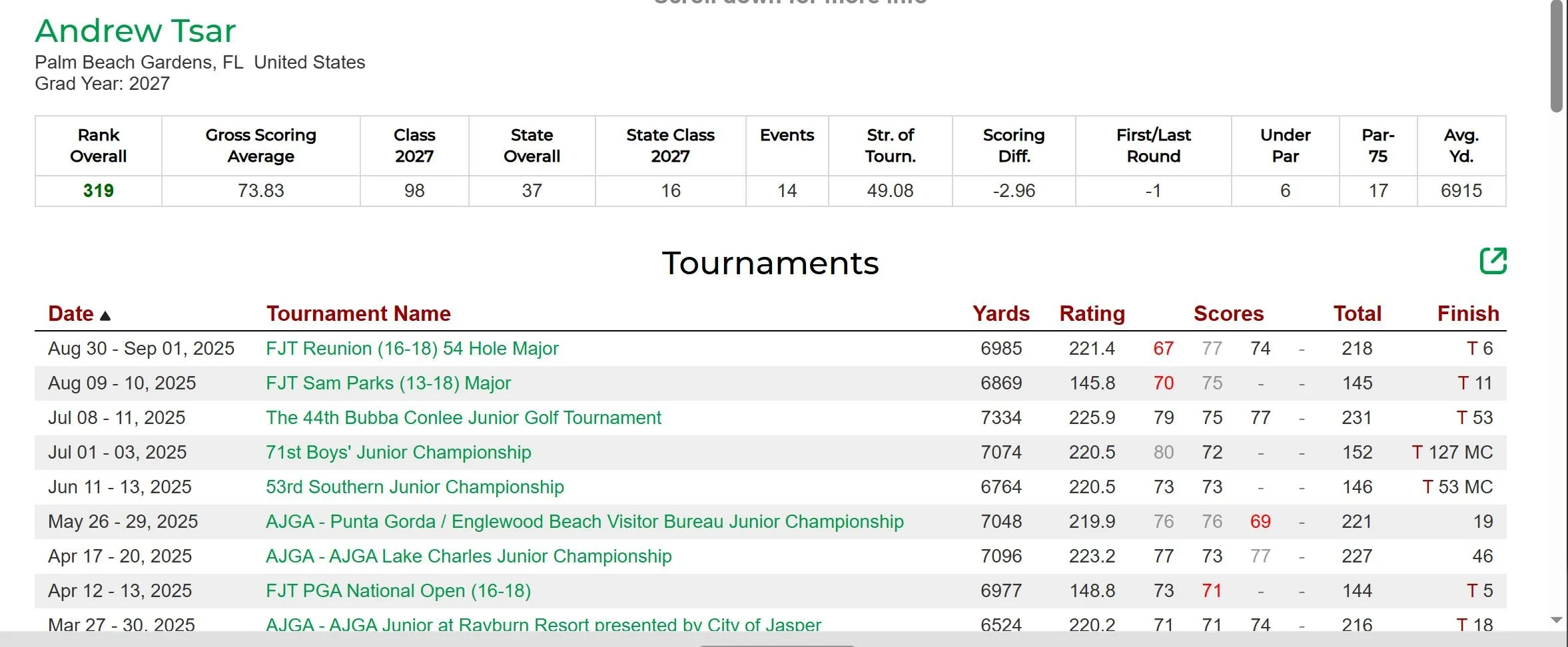 Ranked #16 in Florida for the class of 2027 / #98 National Rank for class of 2027/ #319 overall golfer on JGS/ -2.96 Scoring Differential / +4.2 GHIN/ Ranked #303 overall, #60 for class of 2027 and #14 in Florida on AJGA